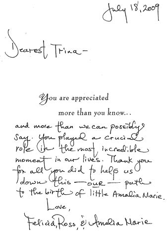 There were frightening moments, but your face never showed signs of fear. You stayed calm so that you could guide us through the process and help us make the best decision for "Team Amalia." And in the stolen moments of calm, you laughed with us to lift our spirits. In the end, you helped us deliver a perfect, beautiful baby. Please know that you will always be in our hearts and that we will never forget what you have done for us.