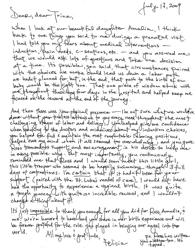 There were frightening moments, but your face never showed signs of fear. You stayed calm so that you could guide us through the process and help us make the best decision for "Team Amalia." And in the stolen moments of calm, you laughed with us to lift our spirits. In the end, you helped us deliver a perfect, beautiful baby. Please know that you will always be in our hearts and that we will never forget what you have done for us.